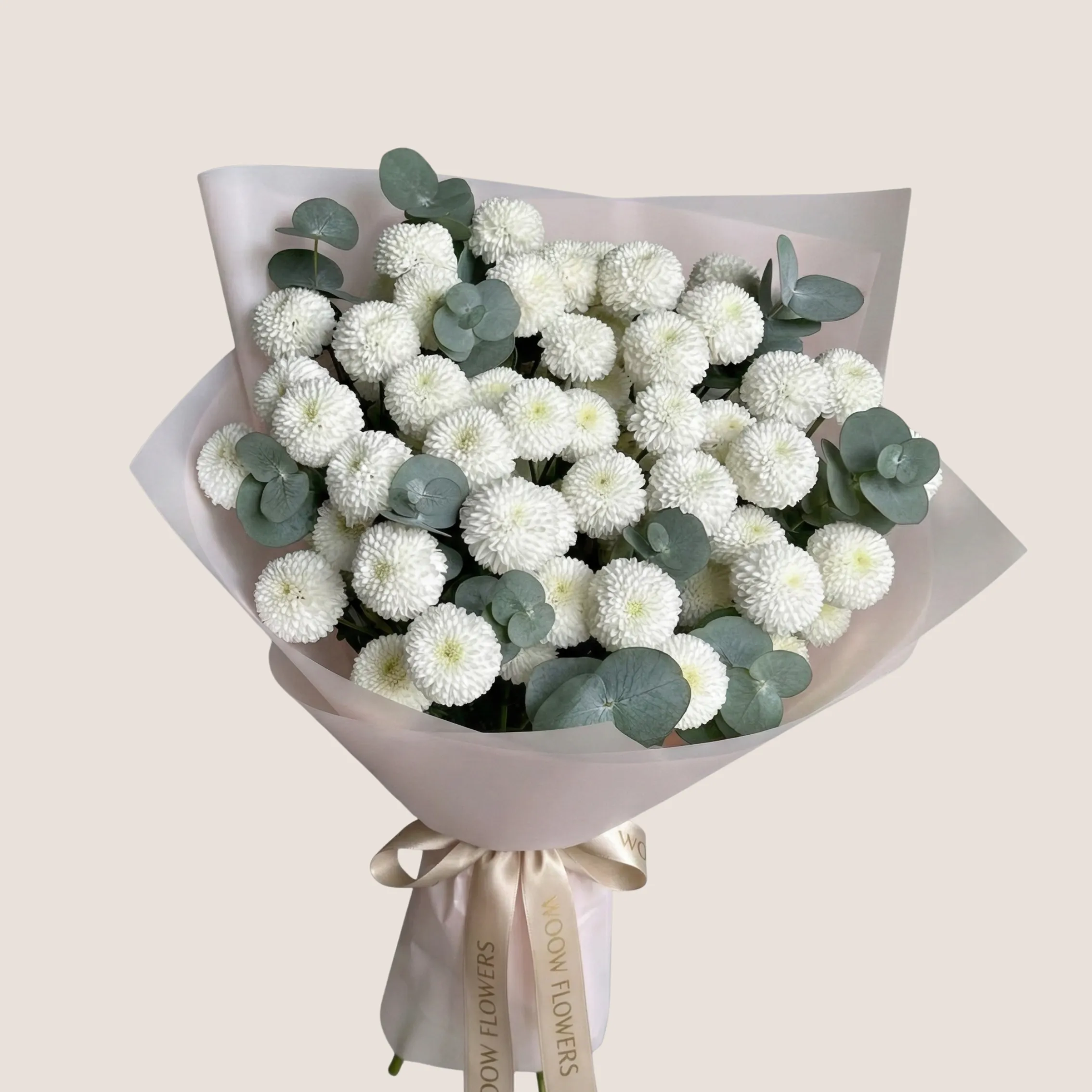 A graceful and modern arrangement of 20 premium White Ping Pong Chrysanthemums. Sourced from the best farms and finished with our signature WOOW FLOWERS ribbon, it is the perfect choice for serene and elegant gifting.